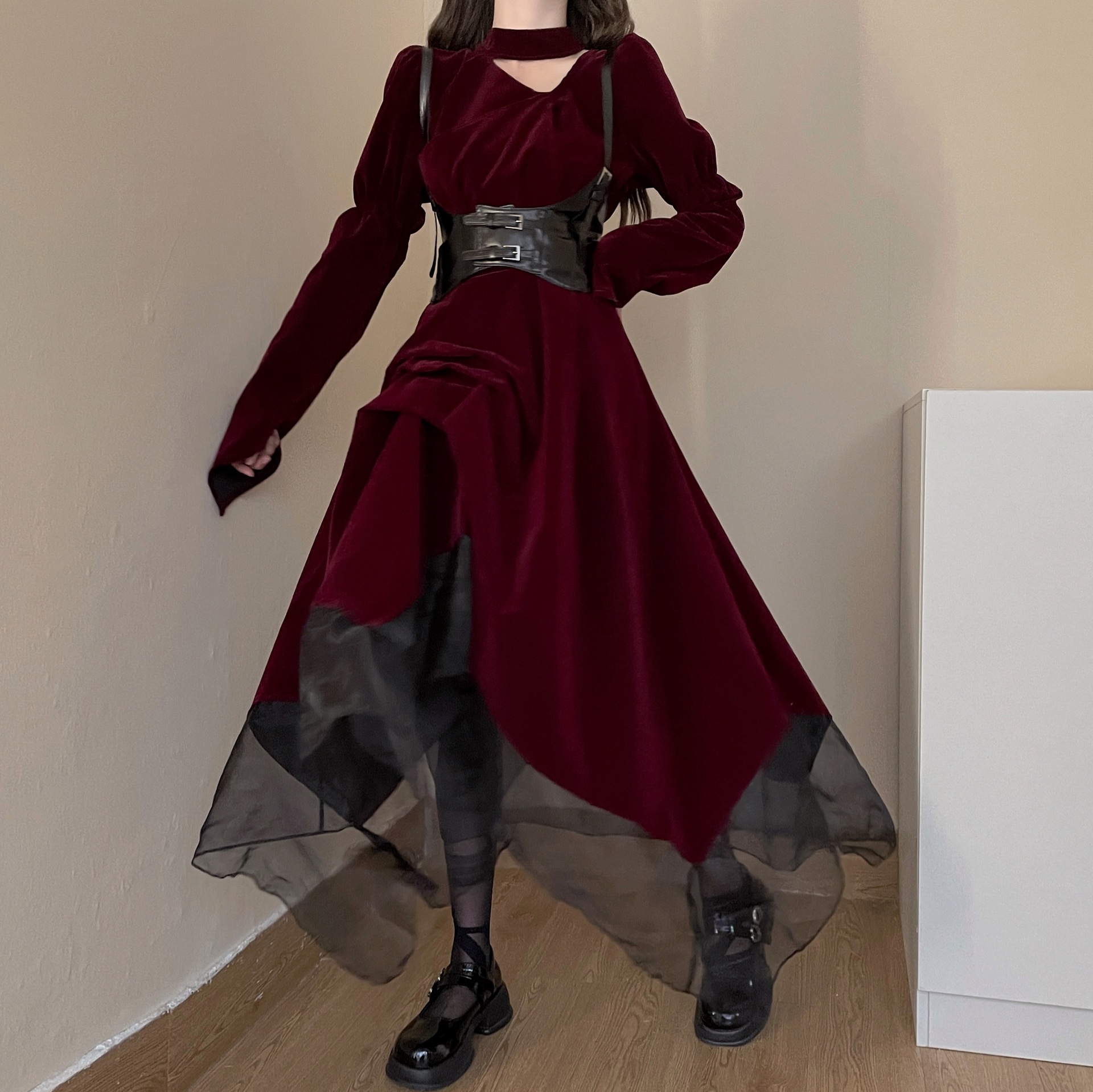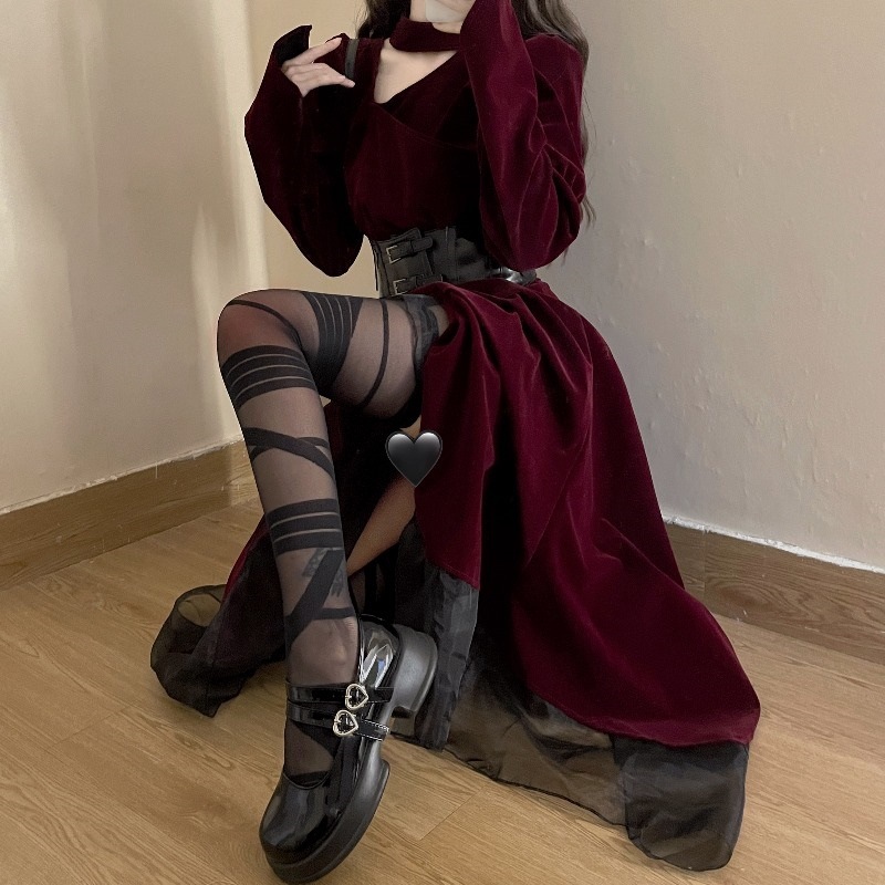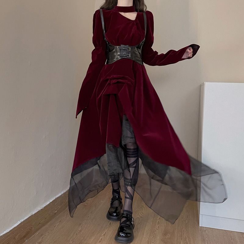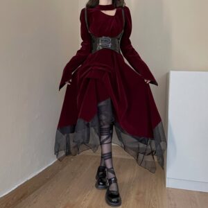 Retro Red Velvet Waist Up Dress – Gothic Aesthetic quantity