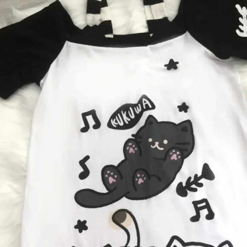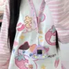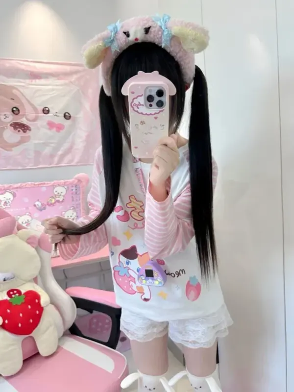 Kawaii Long Sleeve Striped Shirt combines cozy pastel pink and white stripes with an adorable center design featuring a cute cat snuggling a strawberry~ 🍓✨