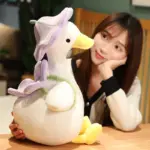 Her soft, snowy-white feathers are as huggable as they come, providing endless cuddles and comfort whenever you need it. But what sets Molly apart is her sense of style and adventure, carrying her cute flower backpack as she goes. And let’s not forget Molly’s fashionable hat. With its unique design and playful charm, it’s like the cherry on top of an already delightful duck.