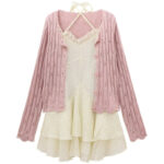 Pink cardigan+apricot dress